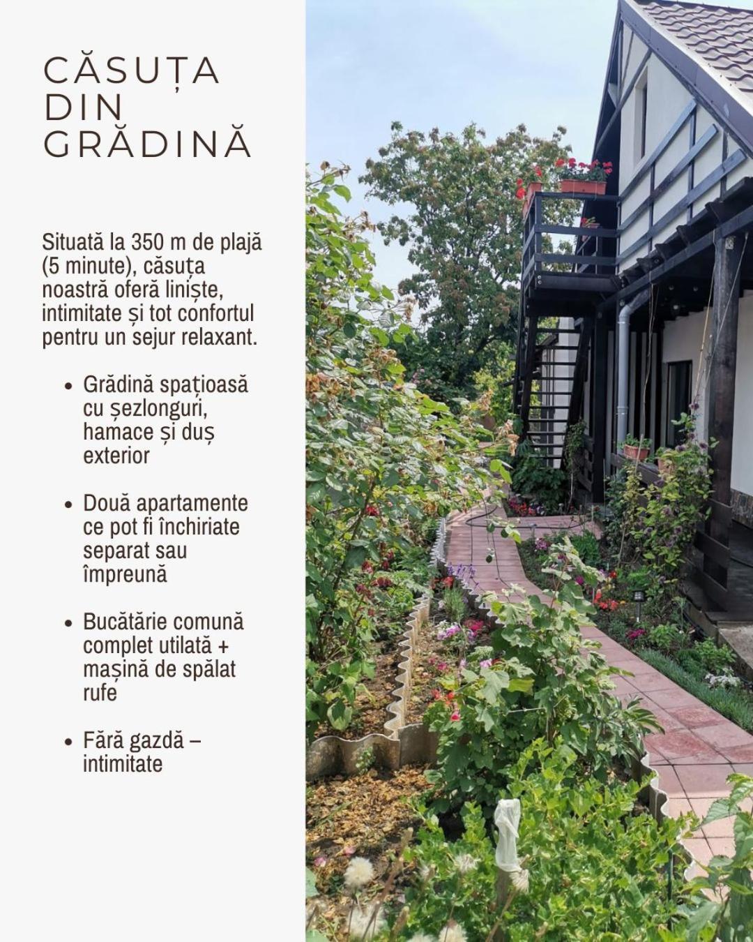 Căsuța din grădină provides a garden, as well as accommodation with a kitchen in 2 Mai, 400 metres from Plaja 2 Mai. This apartment features free private parking and a shared kitchen. Boasting family rooms, this property also provides guests with a sun terrace.
