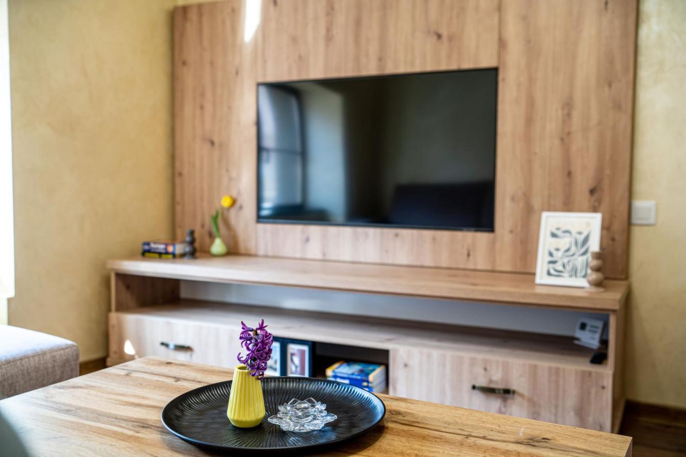 Two-Bedroom Apartment. This spacious apartment comes with 1 living room, 2 separate bedrooms and 1 bathroom with a bath and free toiletries. Meals can be prepared in the kitchen, which features a stovetop, a refrigerator, kitchenware and an oven. This apartment has a washing machine, a coffee machine, flat-screen TV, as well as winechampagne for guests. The unit has 4 beds.