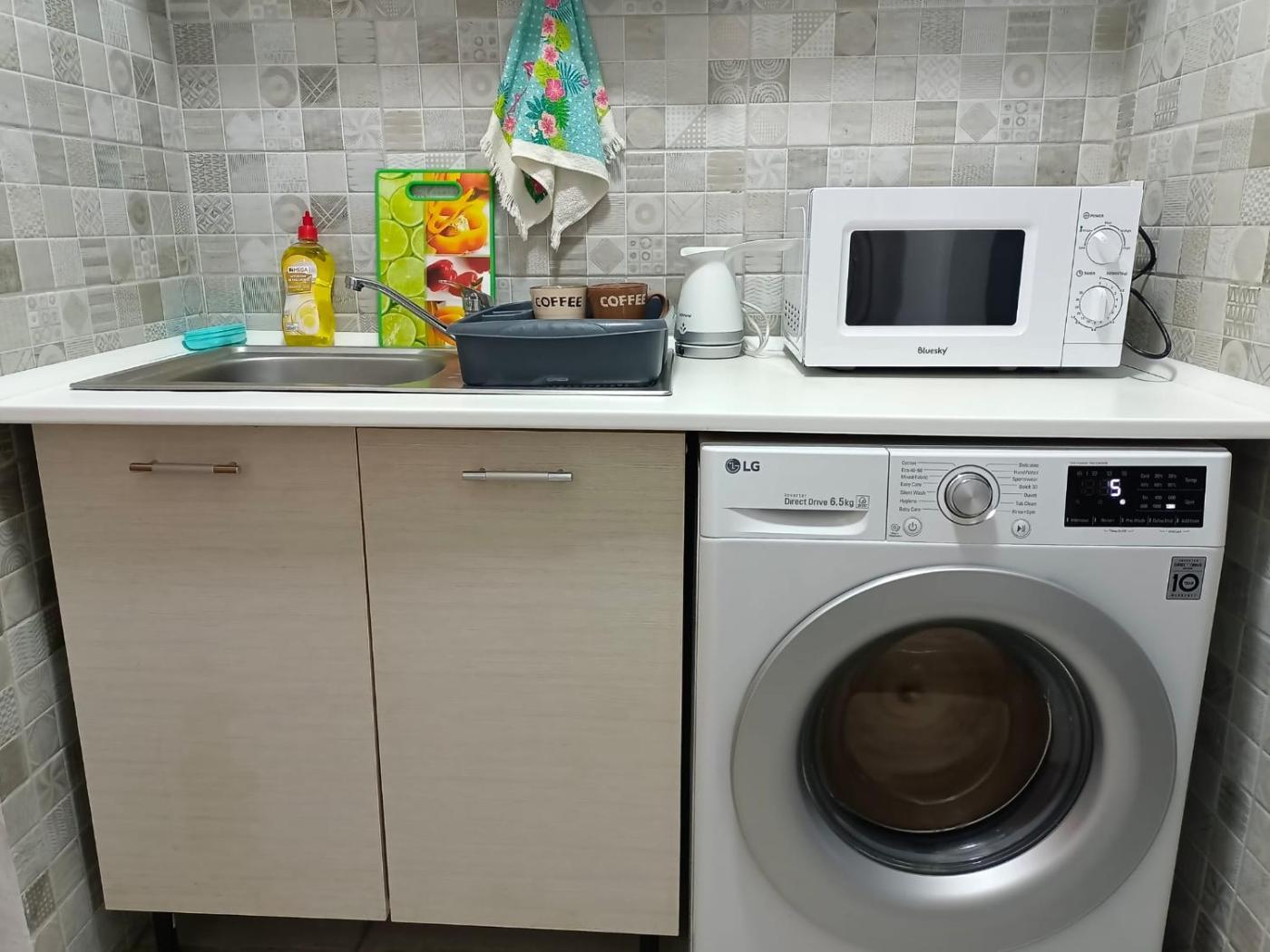 One-Bedroom Apartment. The air-conditioned apartment has 1 bedroom and 1 bathroom with a shower and a hairdryer. The well-fitted kitchen features a stovetop, a refrigerator, kitchenware and a microwave. The apartment features a washing machine, a tea and coffee maker, a seating area, a flat-screen TV with cable channels, as well as a quiet street view. The unit has 1 bed.