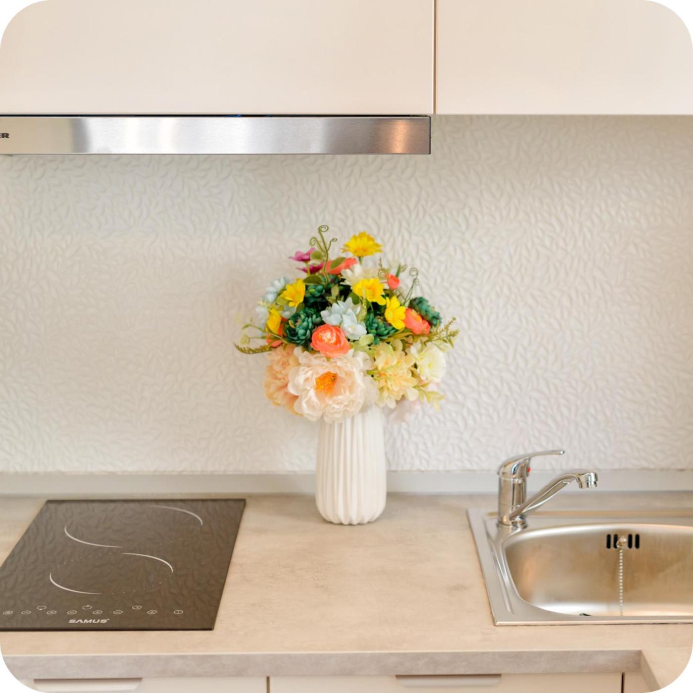 Studio Apartment. The air-conditioned apartment has 1 bedroom and 1 bathroom with a walk-in shower and a hairdryer. Guests can make meals in the kitchen that features a stovetop, a refrigerator, kitchenware and a toaster. The apartment features a washing machine, soundproof walls, a coffee machine, a dining area, as well as a flat-screen TV with cable channels. The unit has 1 bed. ;