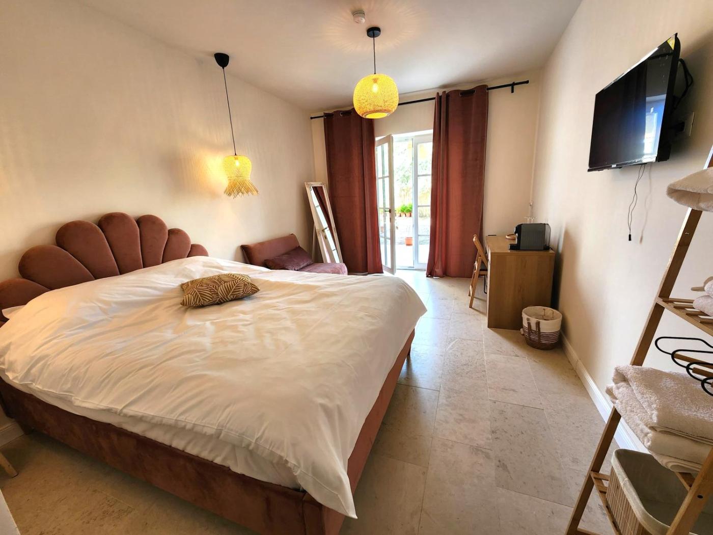 Deluxe Double Room. The double rooms kitchen, which features a refrigerator and kitchenware, is available for cooking and storing food. The double room provides a private entrance, a coffee machine, a terrace with garden views as well as a private bathroom featuring a walk-in shower. The unit offers 2 beds. ;
